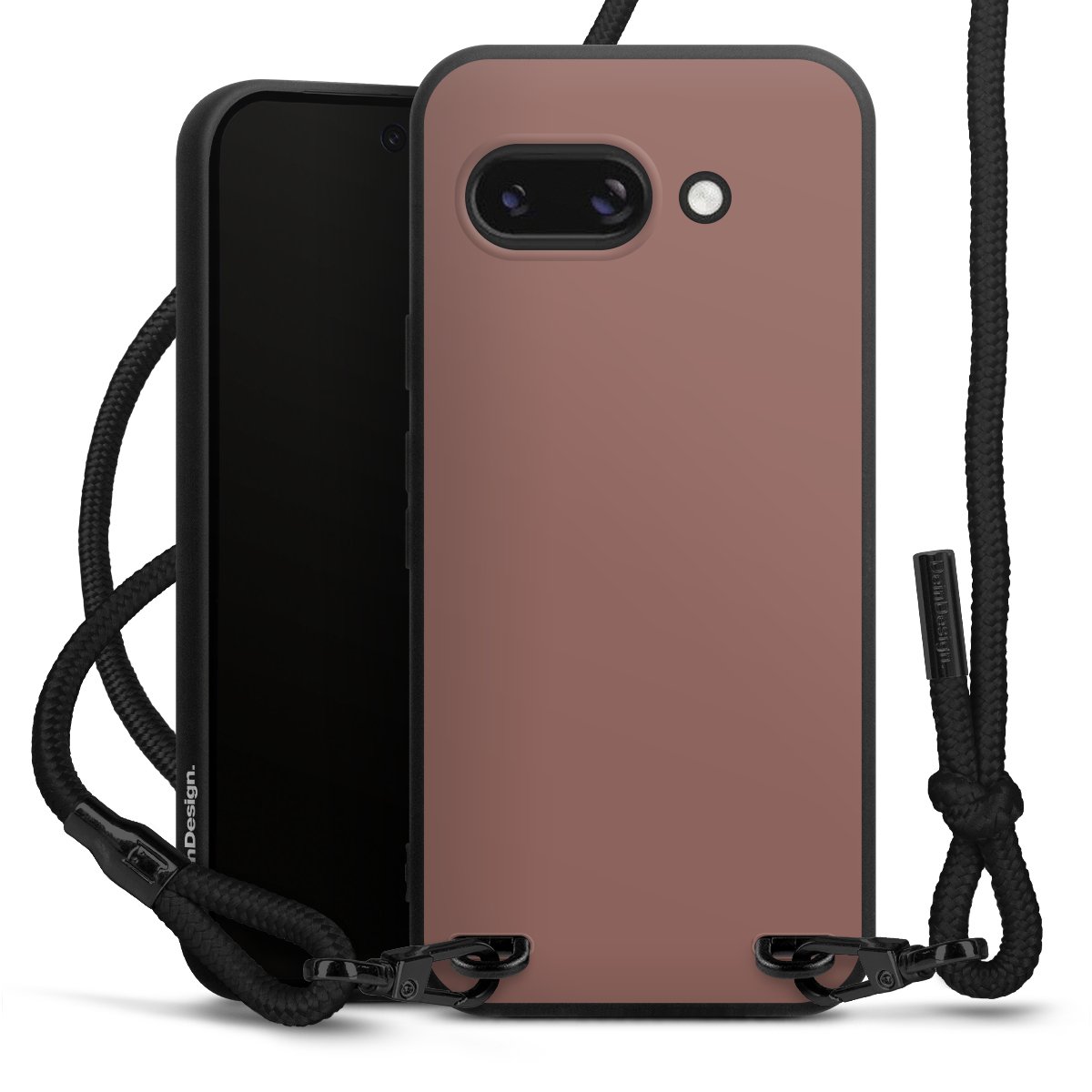 Pure Black: Handyhülle, Stoffband und Metalldetails in stylischem Mattschwarz.