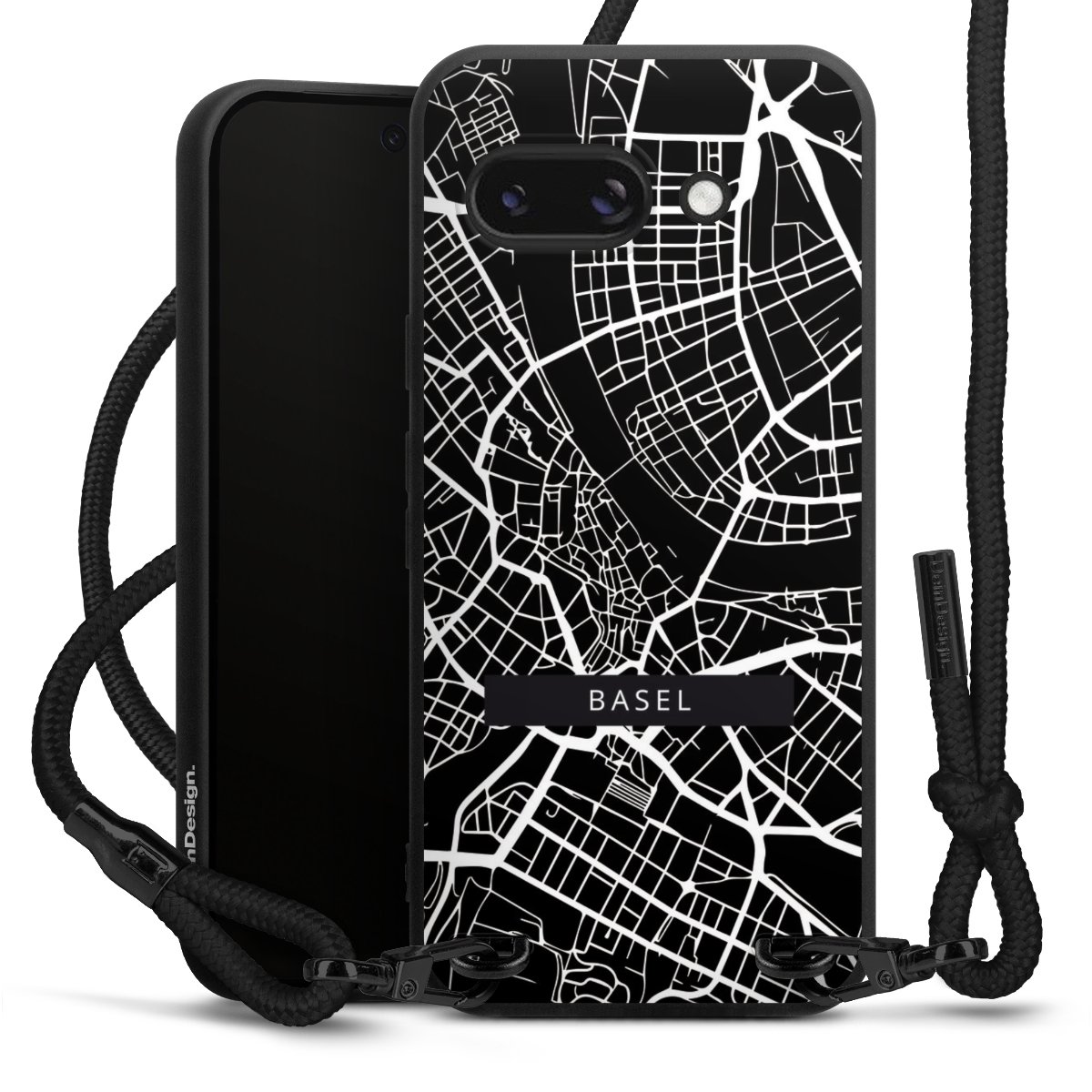 Pure Black: Handyhülle, Stoffband und Metalldetails in stylischem Mattschwarz.