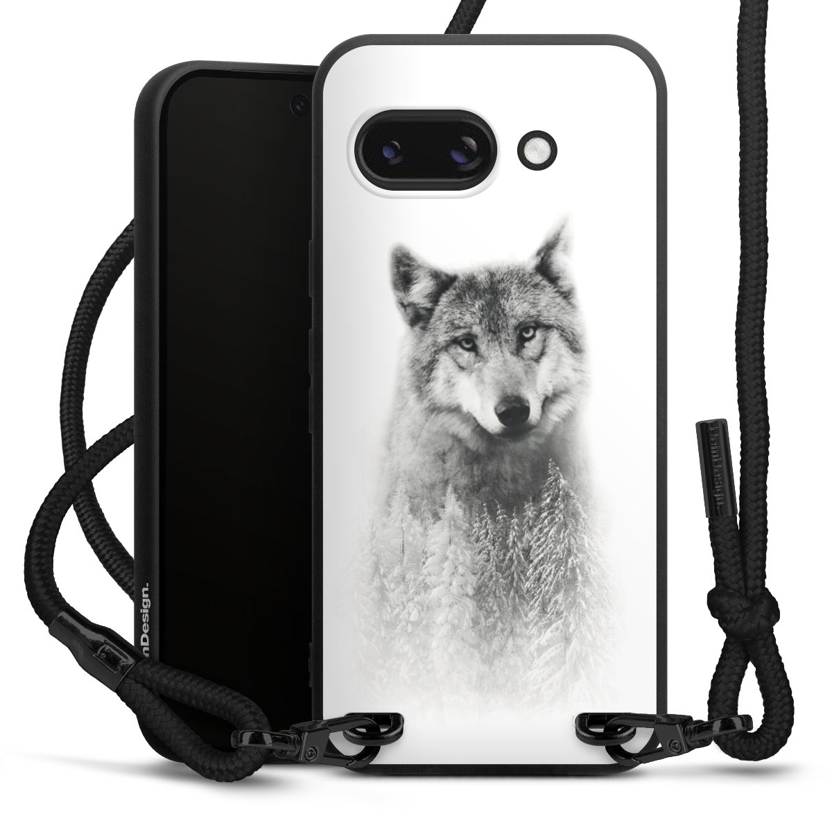 Pure Black: Handyhülle, Stoffband und Metalldetails in stylischem Mattschwarz.
