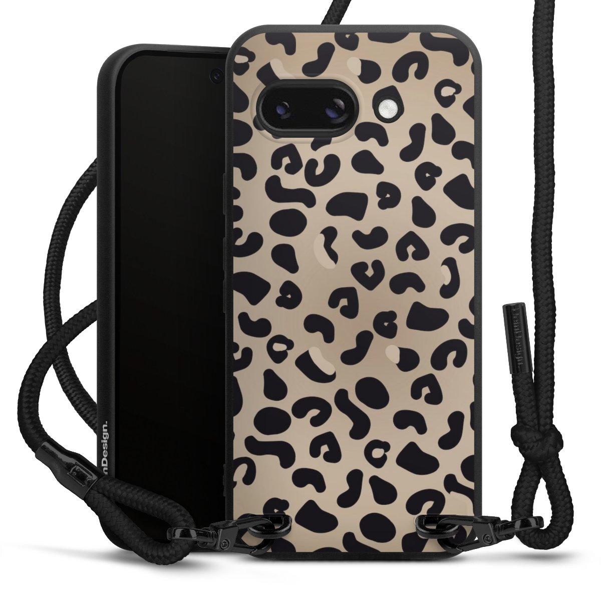 Pure Black: Handyhülle, Stoffband und Metalldetails in stylischem Mattschwarz.