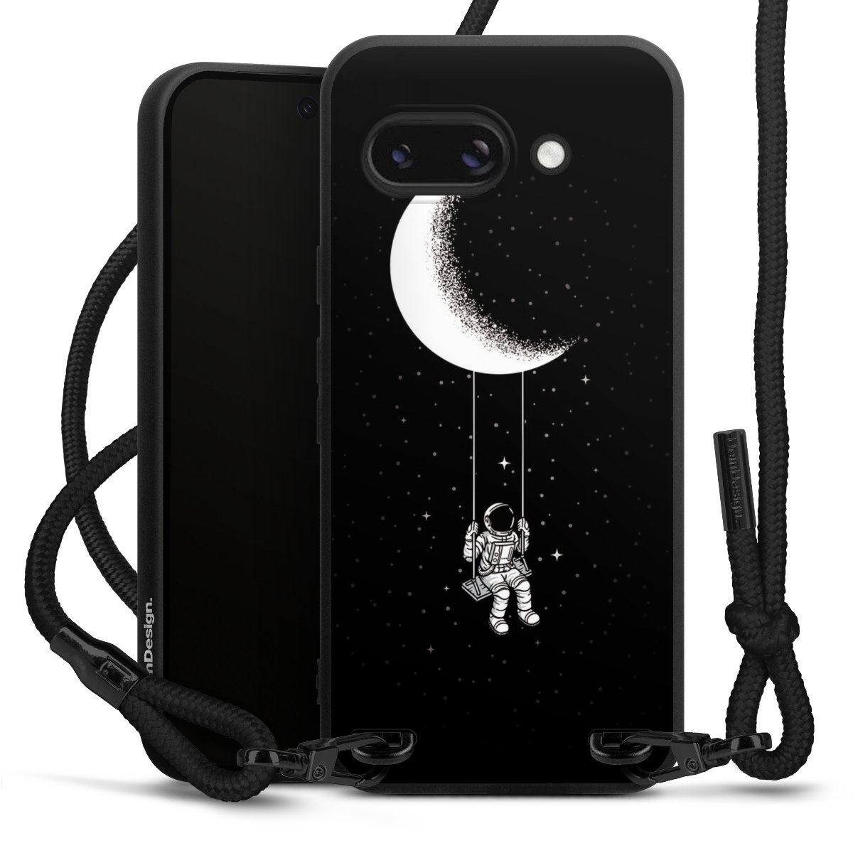 Pure Black: Handyhülle, Stoffband und Metalldetails in stylischem Mattschwarz.