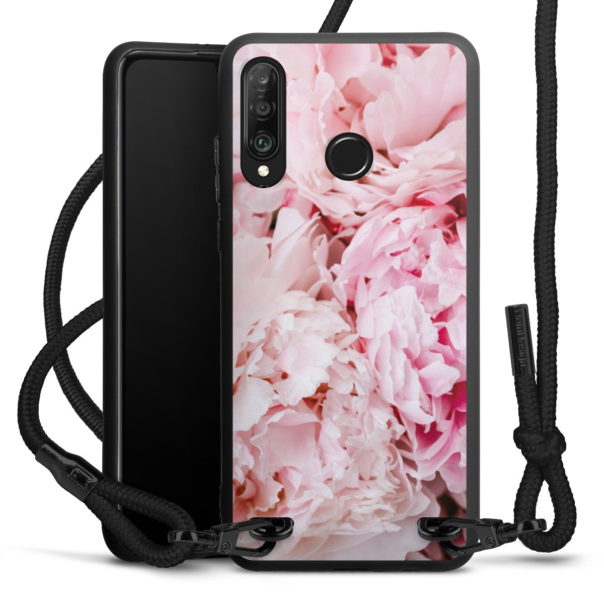 Pure Black: Handyhülle, Stoffband und Metalldetails in stylischem Mattschwarz.