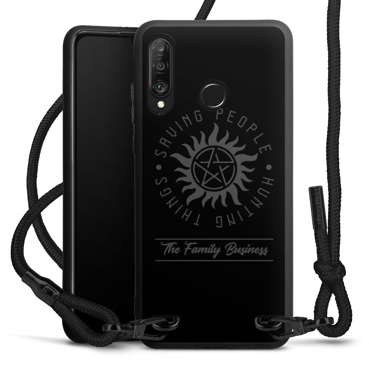 Pure Black: Handyhülle, Stoffband und Metalldetails in stylischem Mattschwarz.