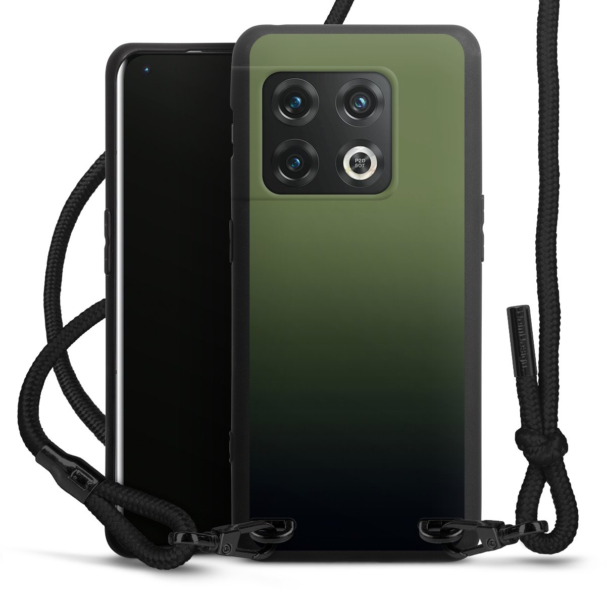 Pure Black: Handyhülle, Stoffband und Metalldetails in stylischem Mattschwarz.