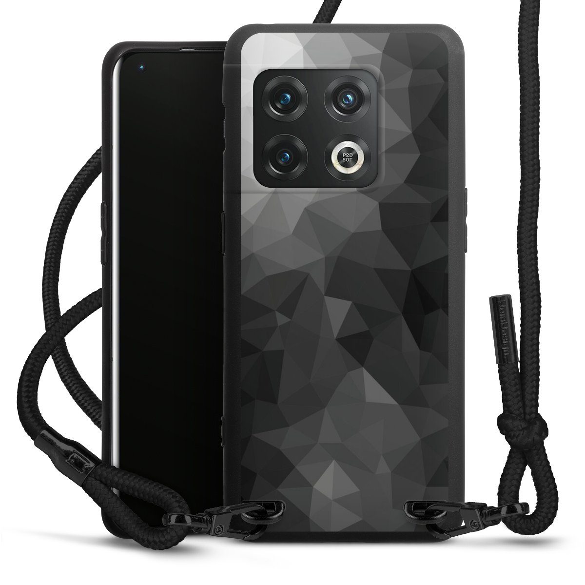 Pure Black: Handyhülle, Stoffband und Metalldetails in stylischem Mattschwarz.