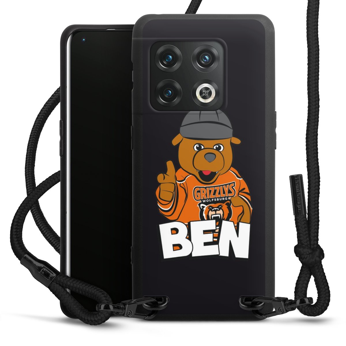 Pure Black: Handyhülle, Stoffband und Metalldetails in stylischem Mattschwarz.