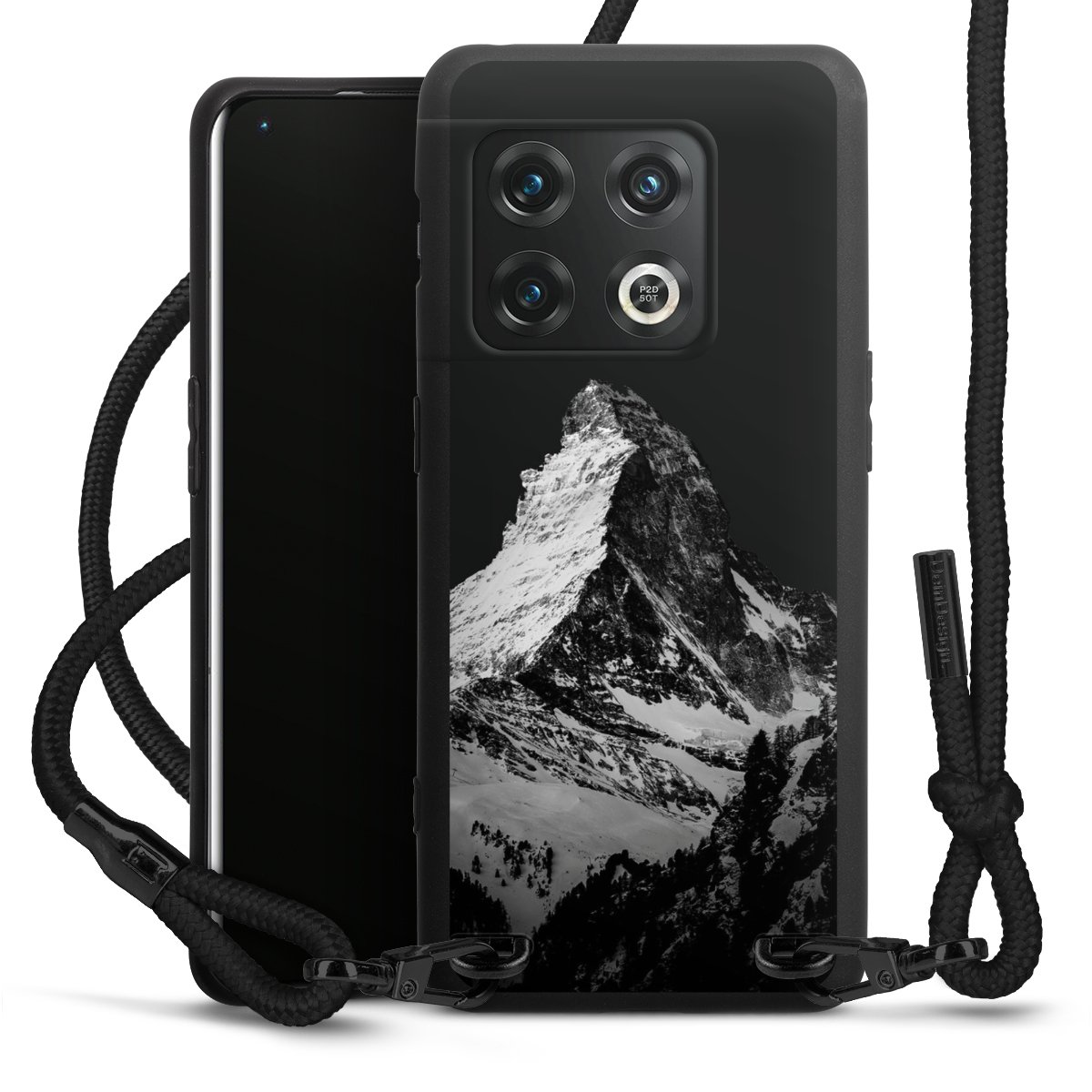 Pure Black: Handyhülle, Stoffband und Metalldetails in stylischem Mattschwarz.