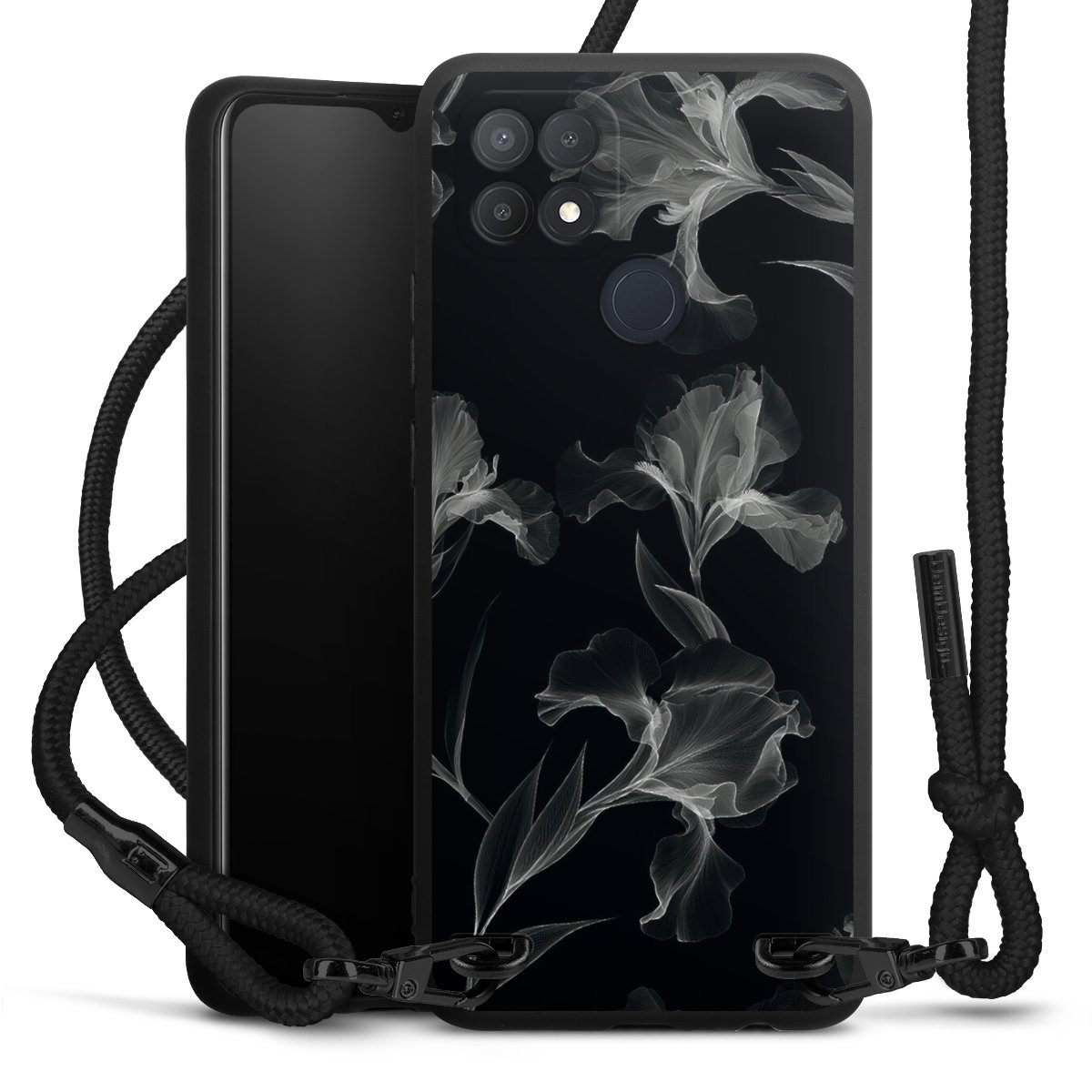 Pure Black: Handyhülle, Stoffband und Metalldetails in stylischem Mattschwarz.