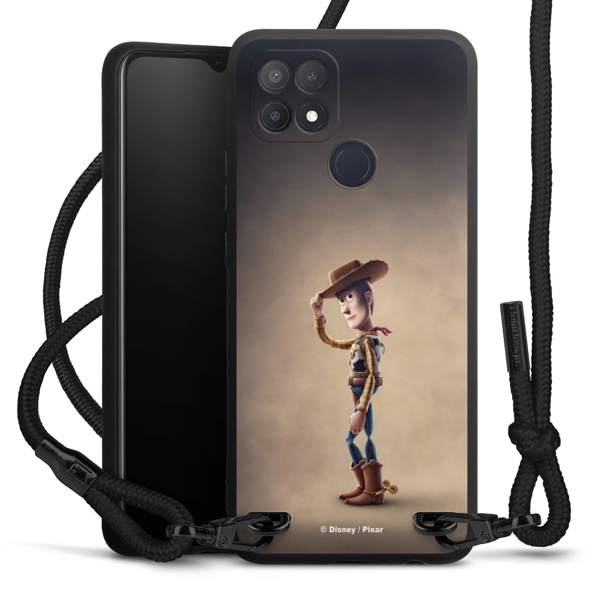 Pure Black: Handyhülle, Stoffband und Metalldetails in stylischem Mattschwarz.