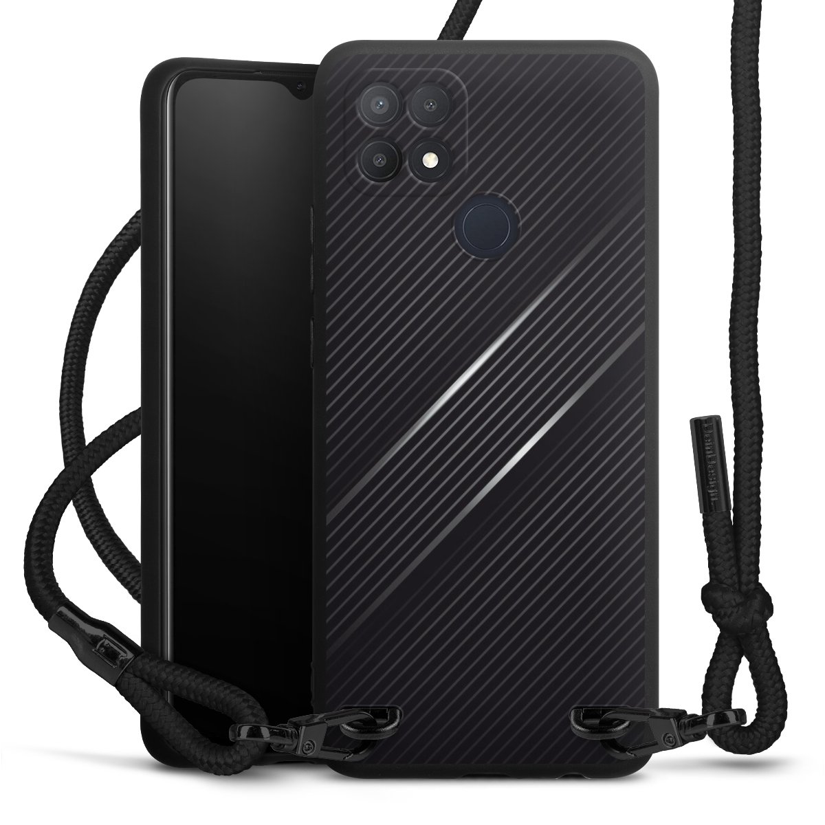 Pure Black: Handyhülle, Stoffband und Metalldetails in stylischem Mattschwarz.