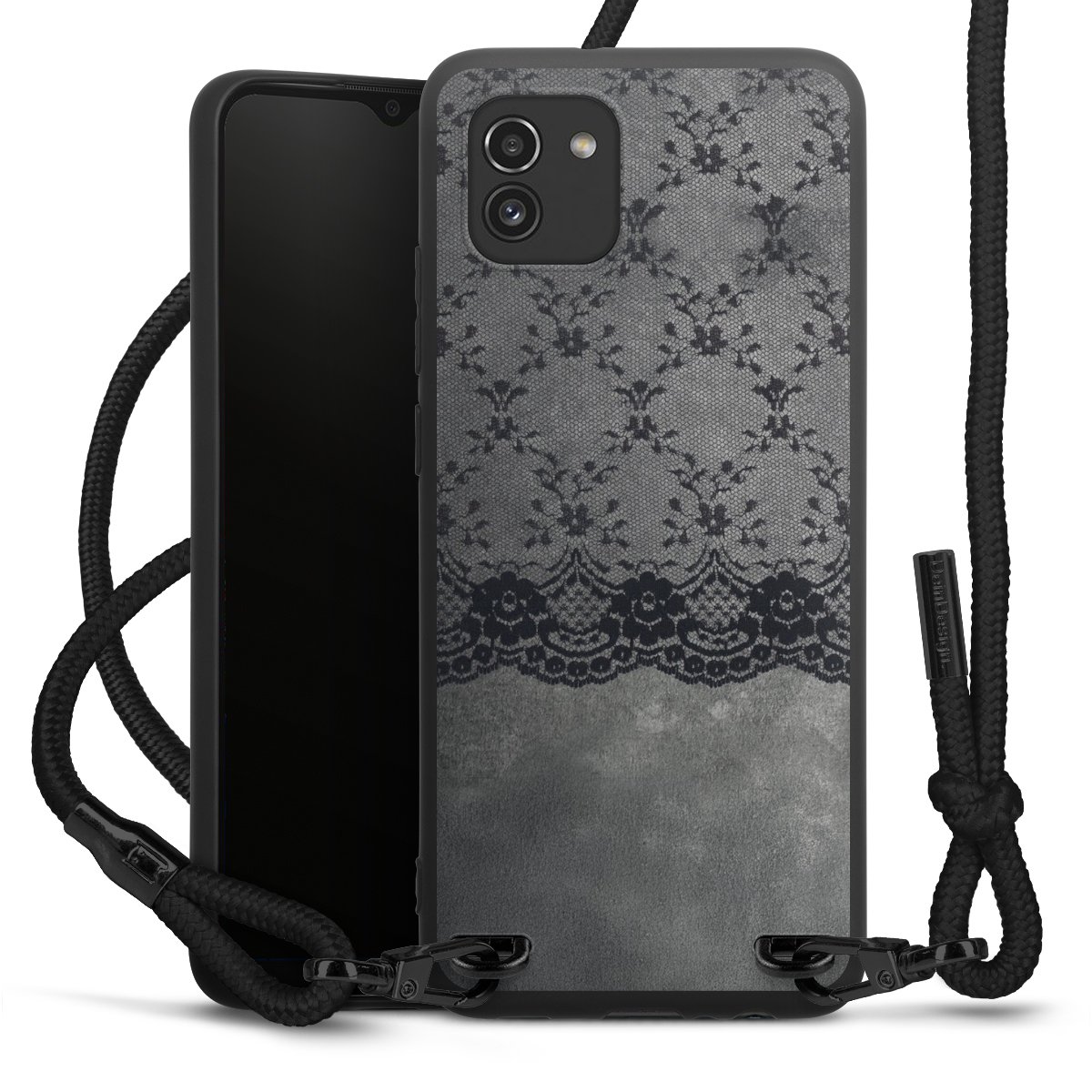 Pure Black: Handyhülle, Stoffband und Metalldetails in stylischem Mattschwarz.