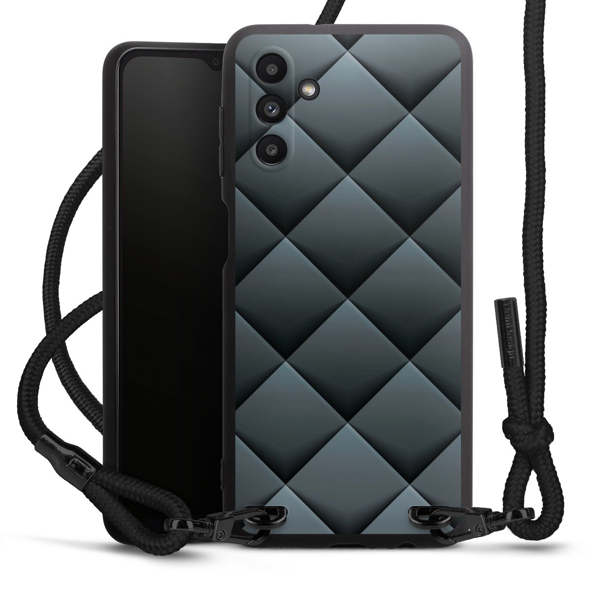 Pure Black: Handyhülle, Stoffband und Metalldetails in stylischem Mattschwarz.