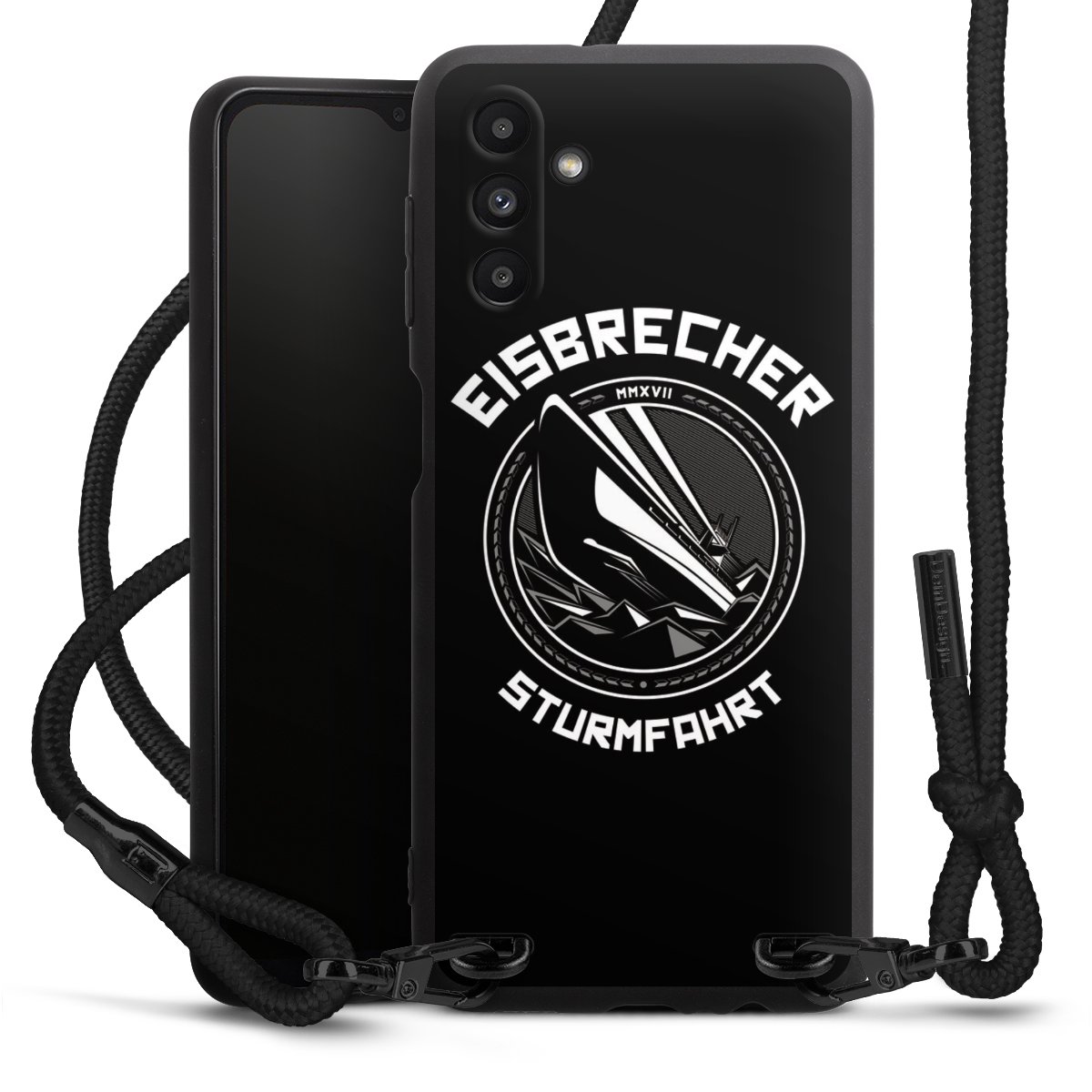 Pure Black: Handyhülle, Stoffband und Metalldetails in stylischem Mattschwarz.