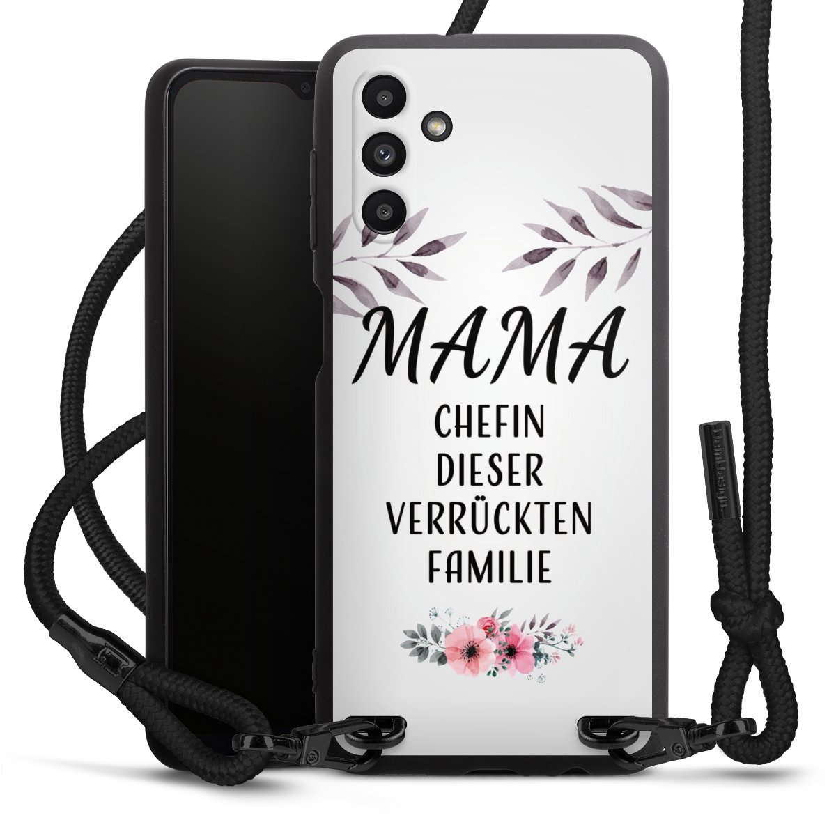Pure Black: Handyhülle, Stoffband und Metalldetails in stylischem Mattschwarz.