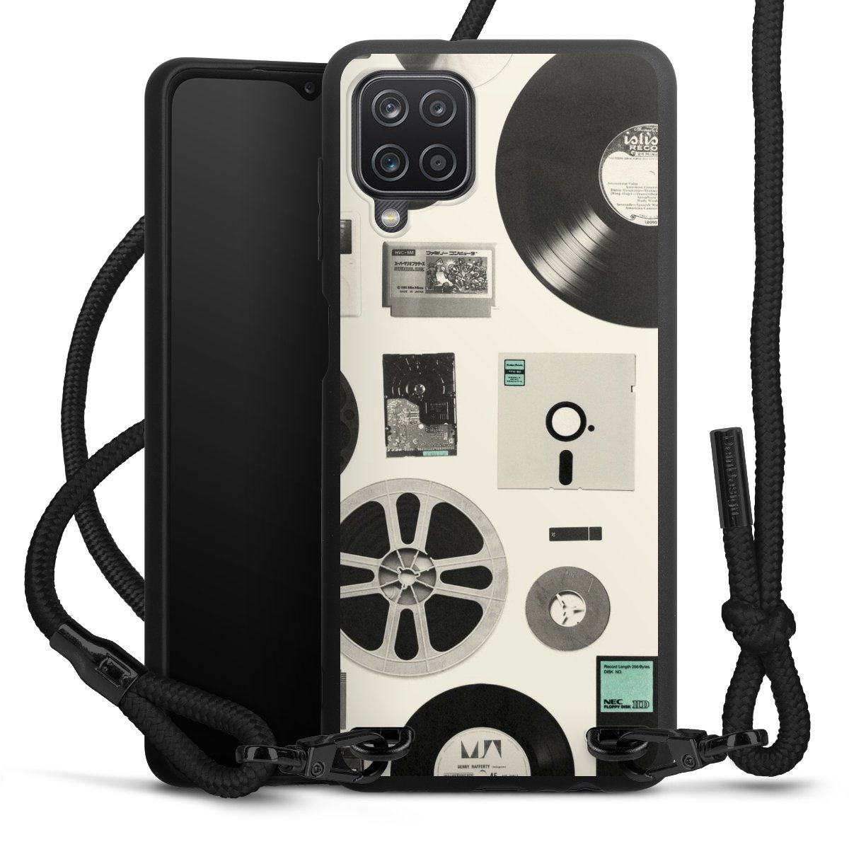 Pure Black: Handyhülle, Stoffband und Metalldetails in stylischem Mattschwarz.