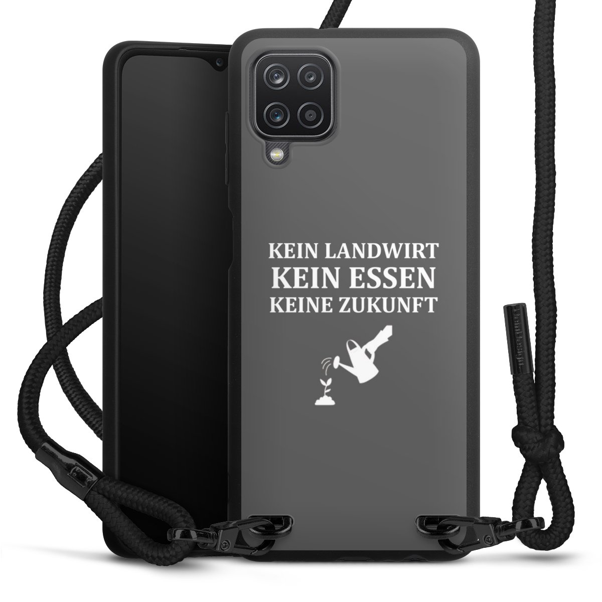 Pure Black: Handyhülle, Stoffband und Metalldetails in stylischem Mattschwarz.