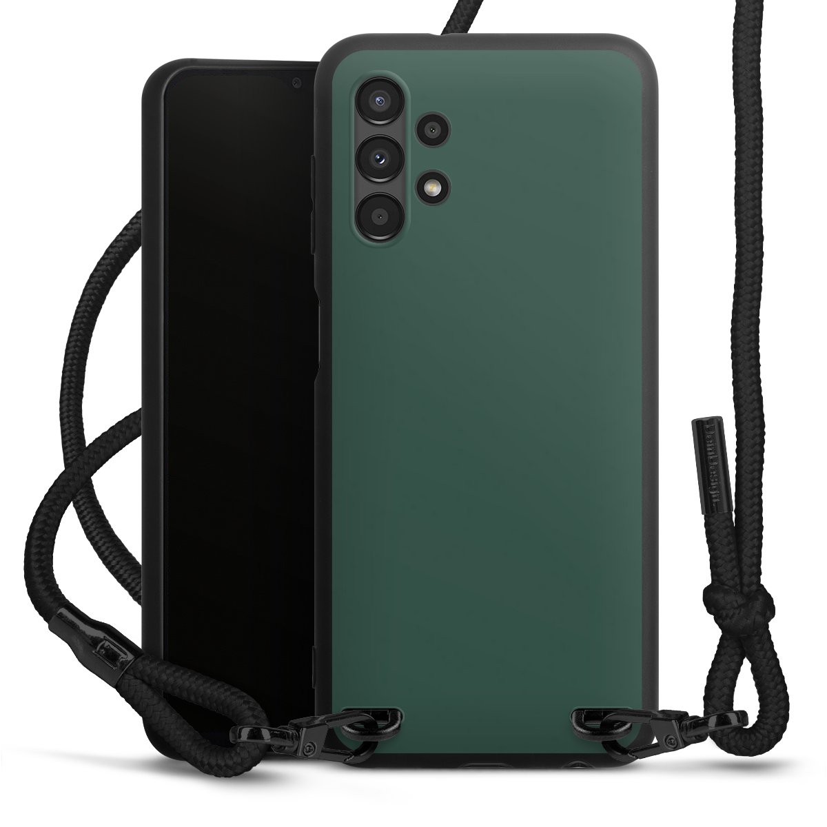 Pure Black: Handyhülle, Stoffband und Metalldetails in stylischem Mattschwarz.