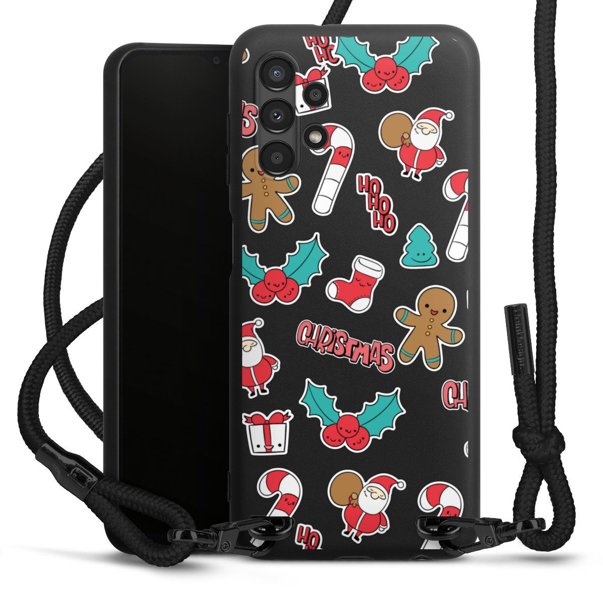 Pure Black: Handyhülle, Stoffband und Metalldetails in stylischem Mattschwarz.