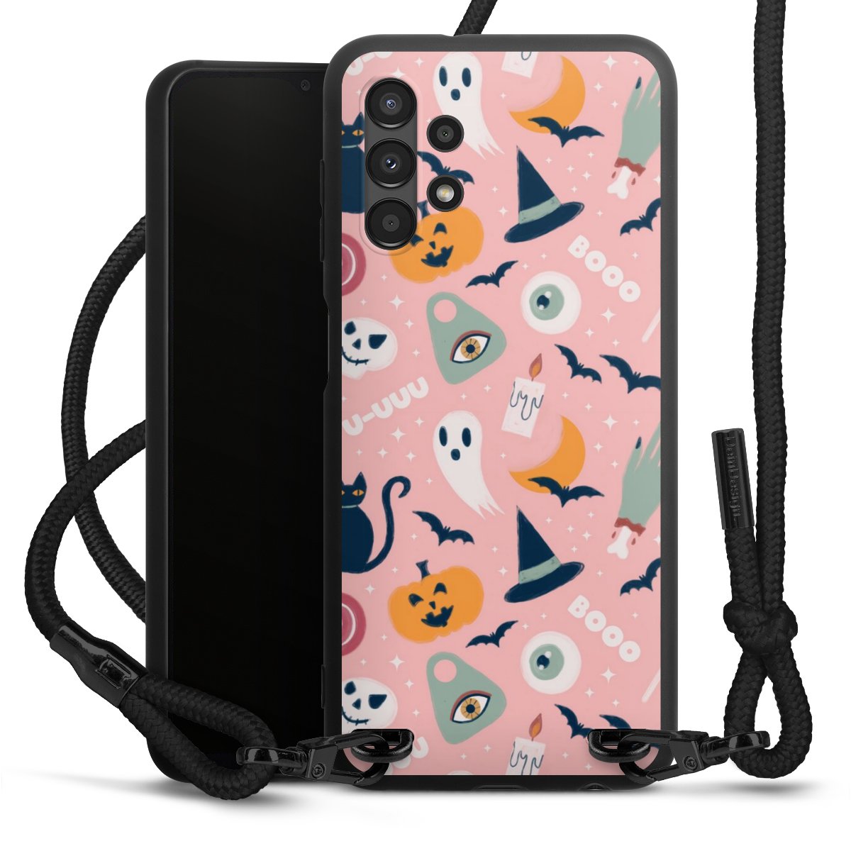 Pure Black: Handyhülle, Stoffband und Metalldetails in stylischem Mattschwarz.
