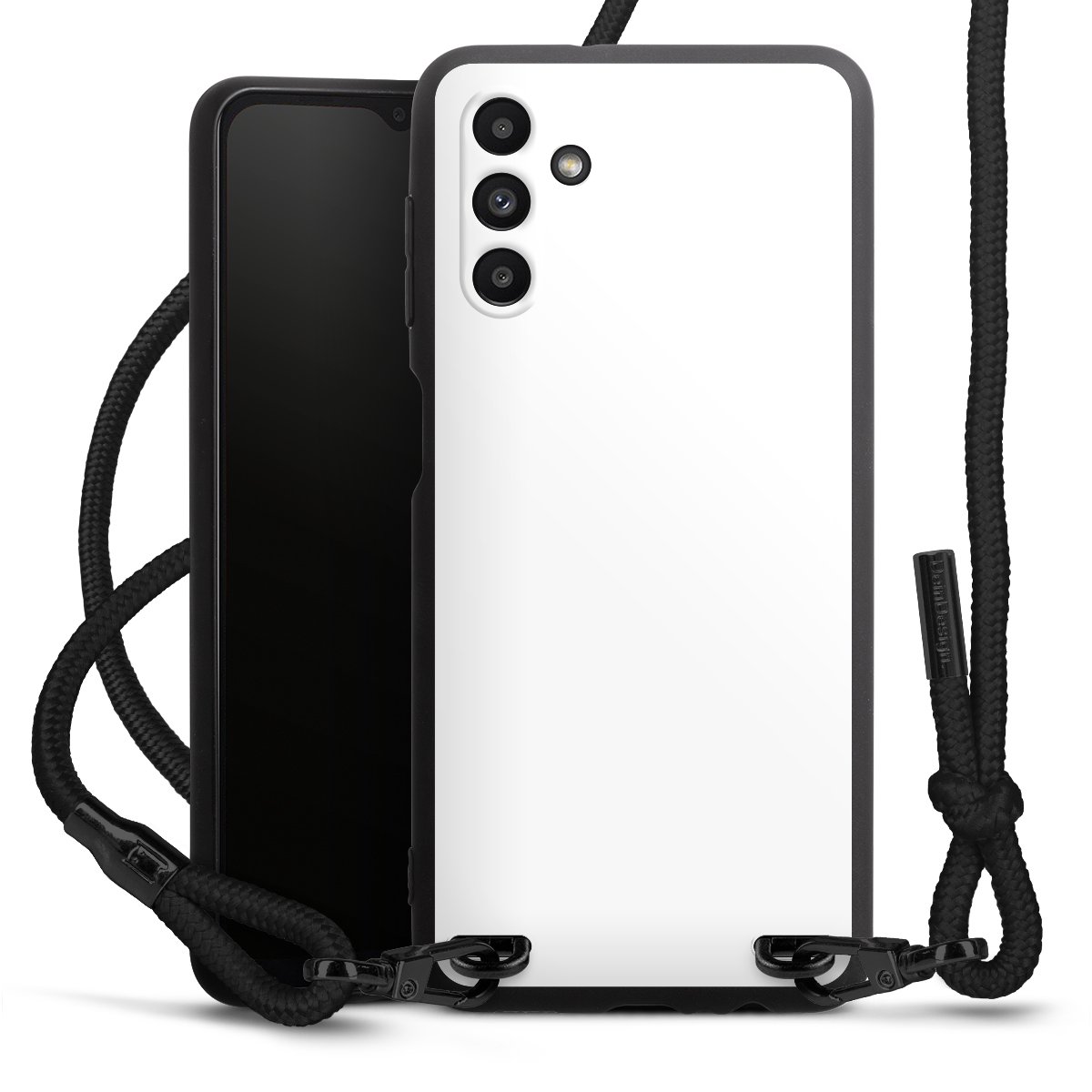 Die mattschwarze Silikonhülle besteht aus flexiblen TPU (thermoplastisches Polyurethan) und bietet robusten Schutz. Durch das langlebige, bruchsichere Material ist die Hülle biegsam und formbeständig zugleich. Die matte Oberfläche lässt Dein Design besser zur Geltung kommen und ist weniger anfällig für Fingerabdrücke und Schmutz. Das stylische Trend-Accessoire liegt griffig in der Hand und wird optimal von der Handykette aus Stoff (Polyester) ergänzt. Das geflochtene Stoffband ist ca. 1,70 Meter lang mit einem Durchmesser von ca. 0,5cm. Aufgrund der besonderen Knotentechnik ist das Band durch einfaches Ziehen in der Länge verstellbar. Als kleines i-Tüpfelchen haben wir das Band mit schicken Metall-Verschlüssen in Mattschwarz versehen.