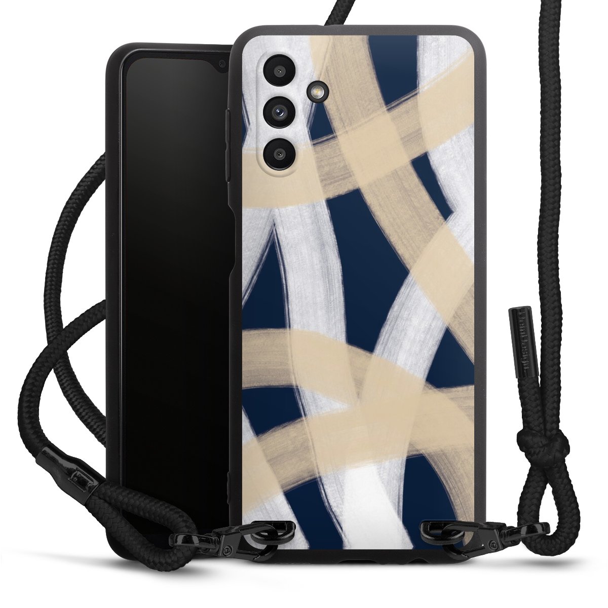 Pure Black: Handyhülle, Stoffband und Metalldetails in stylischem Mattschwarz.
