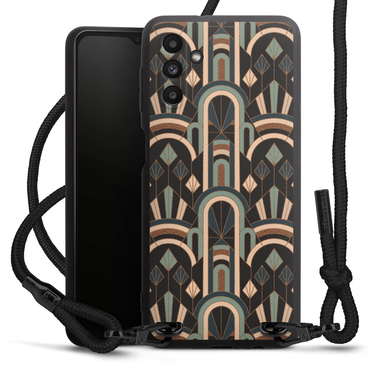 Pure Black: Handyhülle, Stoffband und Metalldetails in stylischem Mattschwarz.