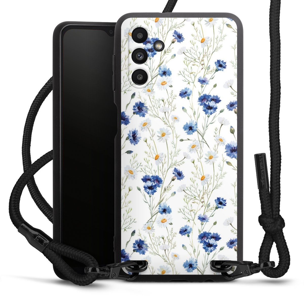 Pure Black: Handyhülle, Stoffband und Metalldetails in stylischem Mattschwarz.