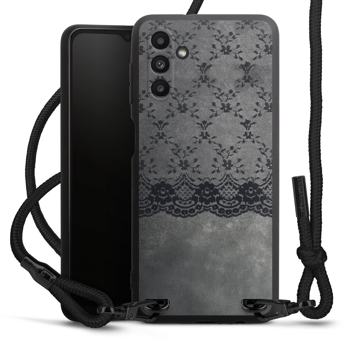 Pure Black: Handyhülle, Stoffband und Metalldetails in stylischem Mattschwarz.
