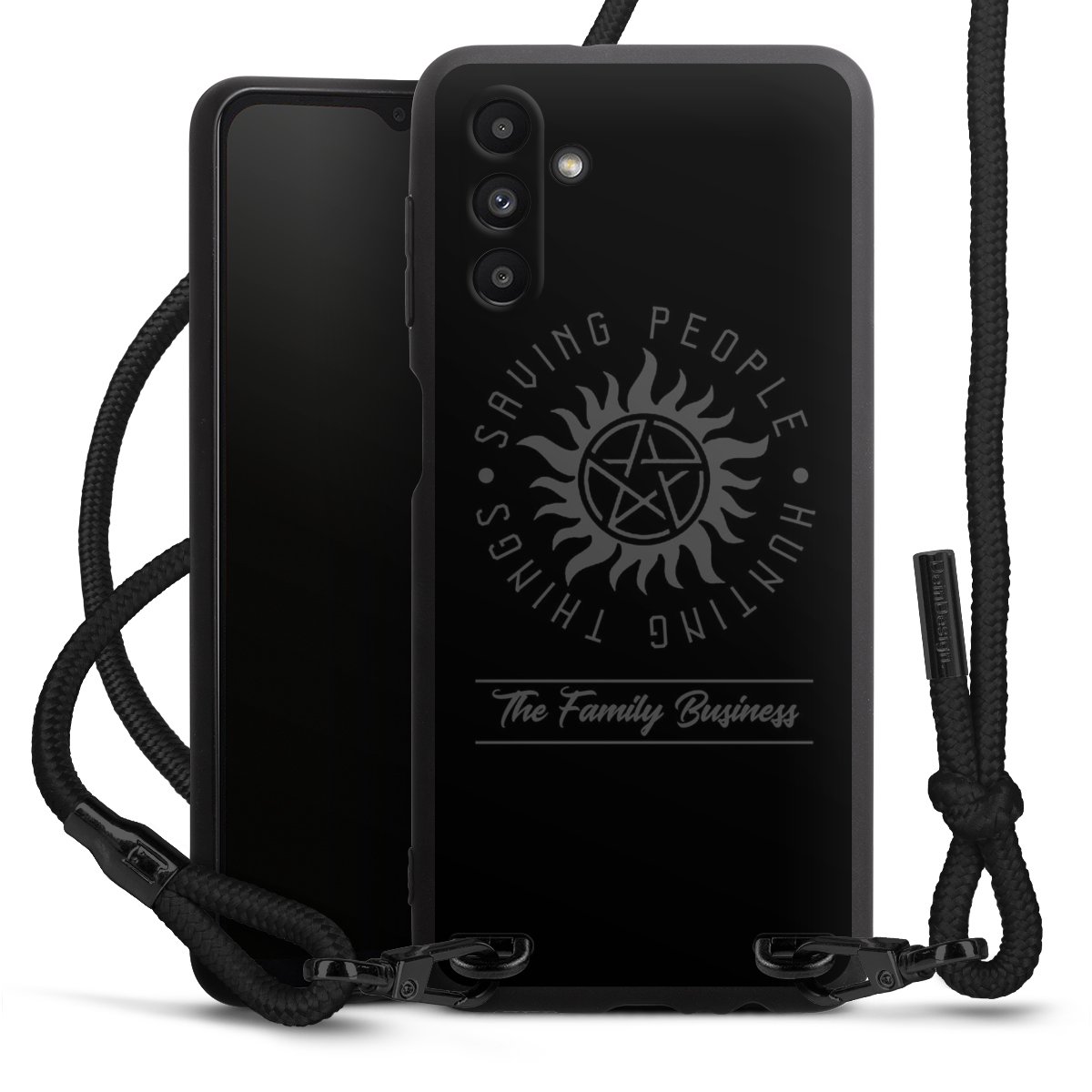Pure Black: Handyhülle, Stoffband und Metalldetails in stylischem Mattschwarz.