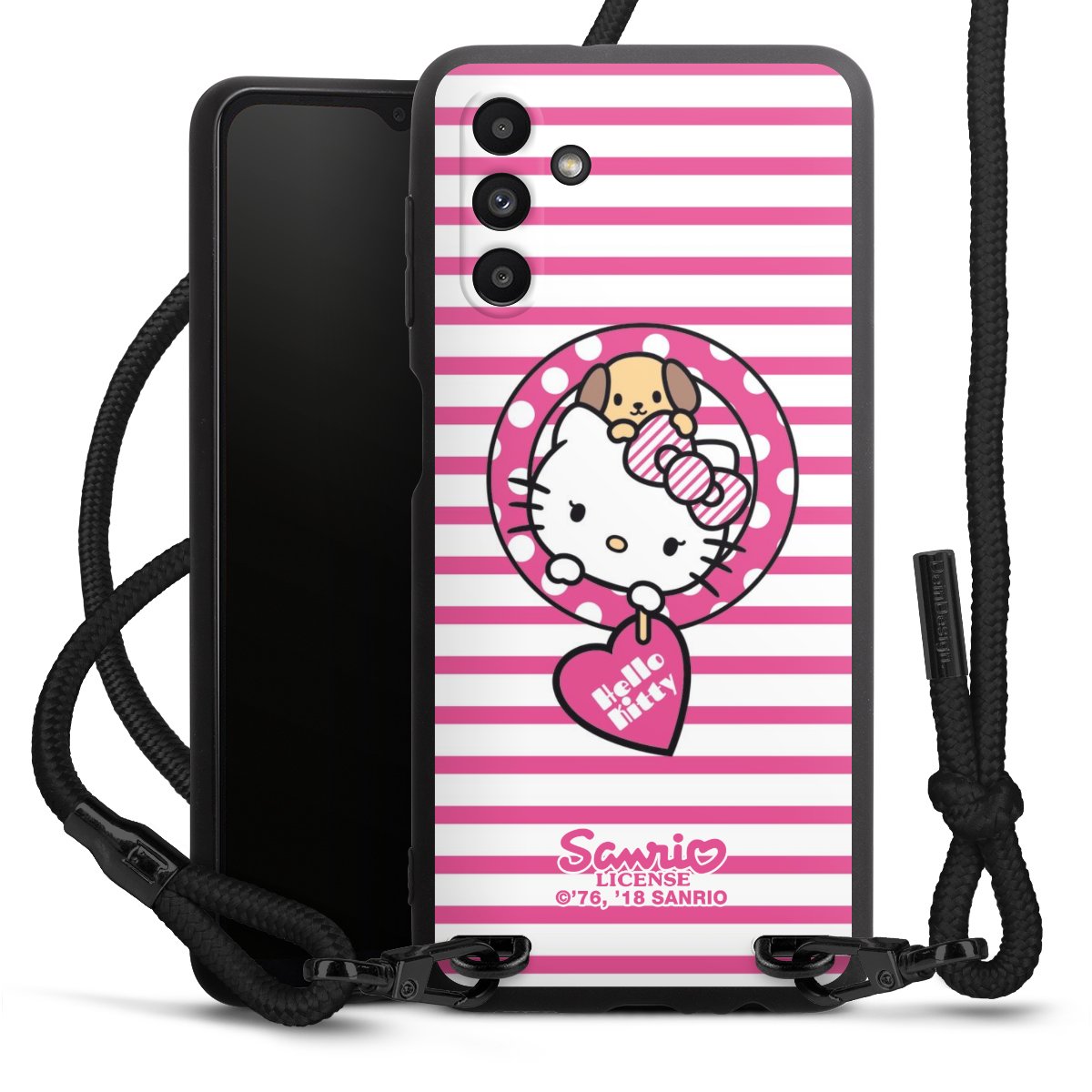 Pure Black: Handyhülle, Stoffband und Metalldetails in stylischem Mattschwarz.
