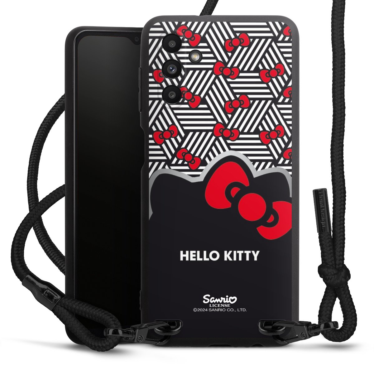 Pure Black: Handyhülle, Stoffband und Metalldetails in stylischem Mattschwarz.