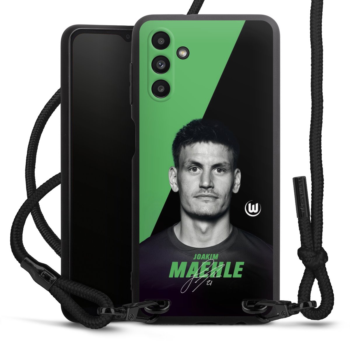 Pure Black: Handyhülle, Stoffband und Metalldetails in stylischem Mattschwarz.