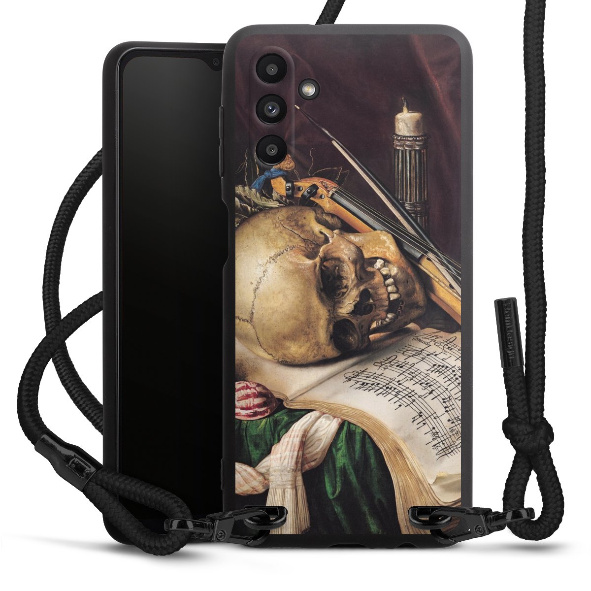 Pure Black: Handyhülle, Stoffband und Metalldetails in stylischem Mattschwarz.