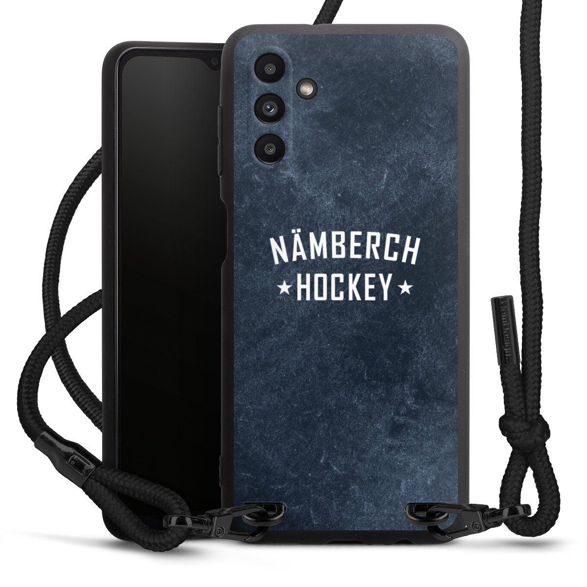 Pure Black: Handyhülle, Stoffband und Metalldetails in stylischem Mattschwarz.