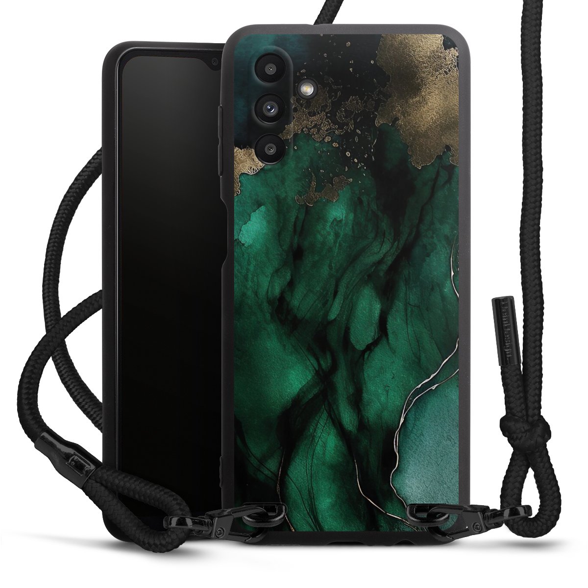 Pure Black: Handyhülle, Stoffband und Metalldetails in stylischem Mattschwarz.