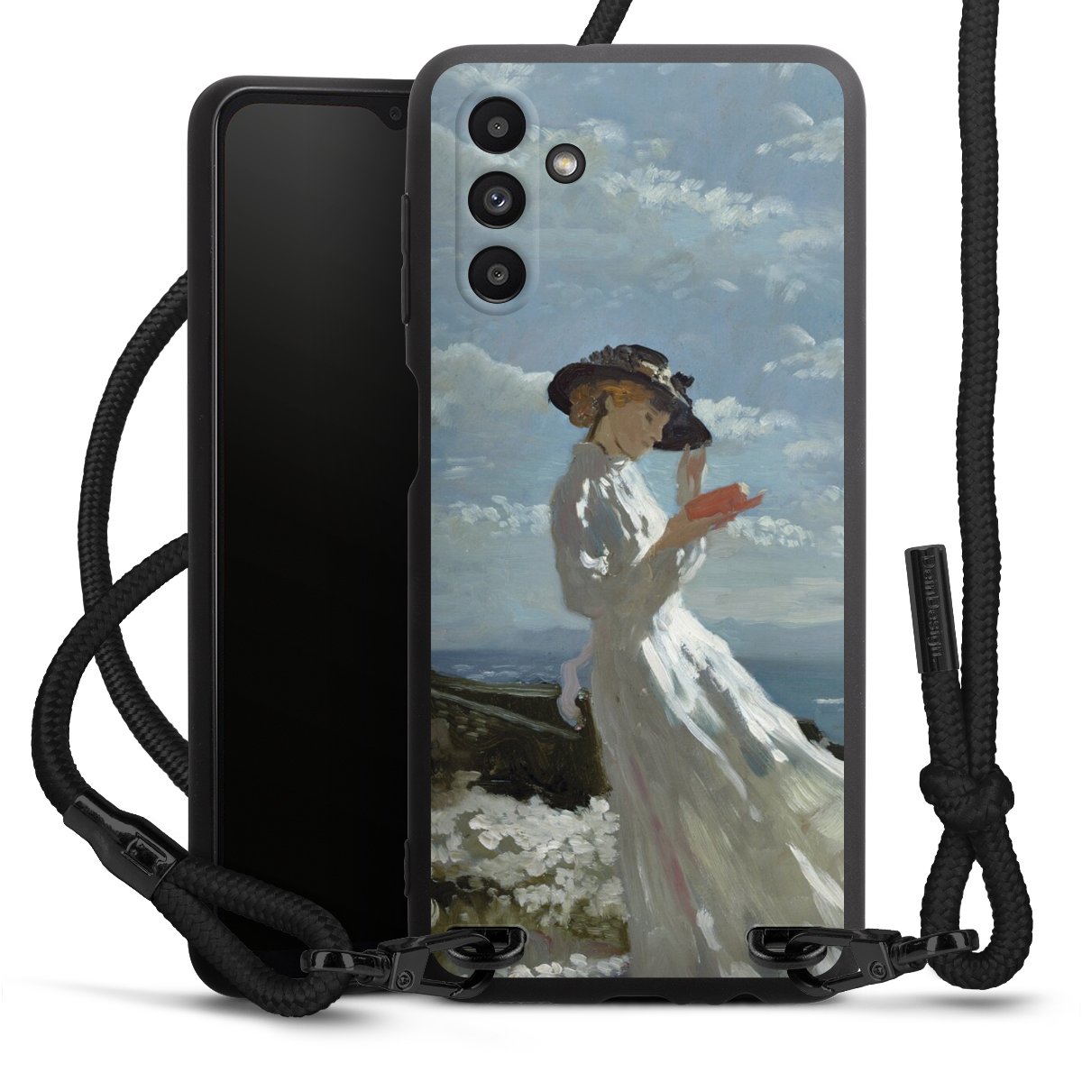 Pure Black: Handyhülle, Stoffband und Metalldetails in stylischem Mattschwarz.