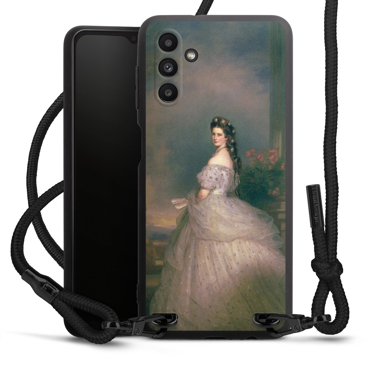 Pure Black: Handyhülle, Stoffband und Metalldetails in stylischem Mattschwarz.