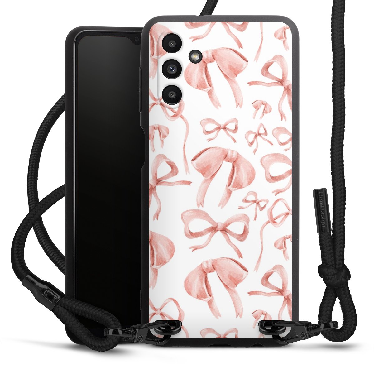 Pure Black: Handyhülle, Stoffband und Metalldetails in stylischem Mattschwarz.