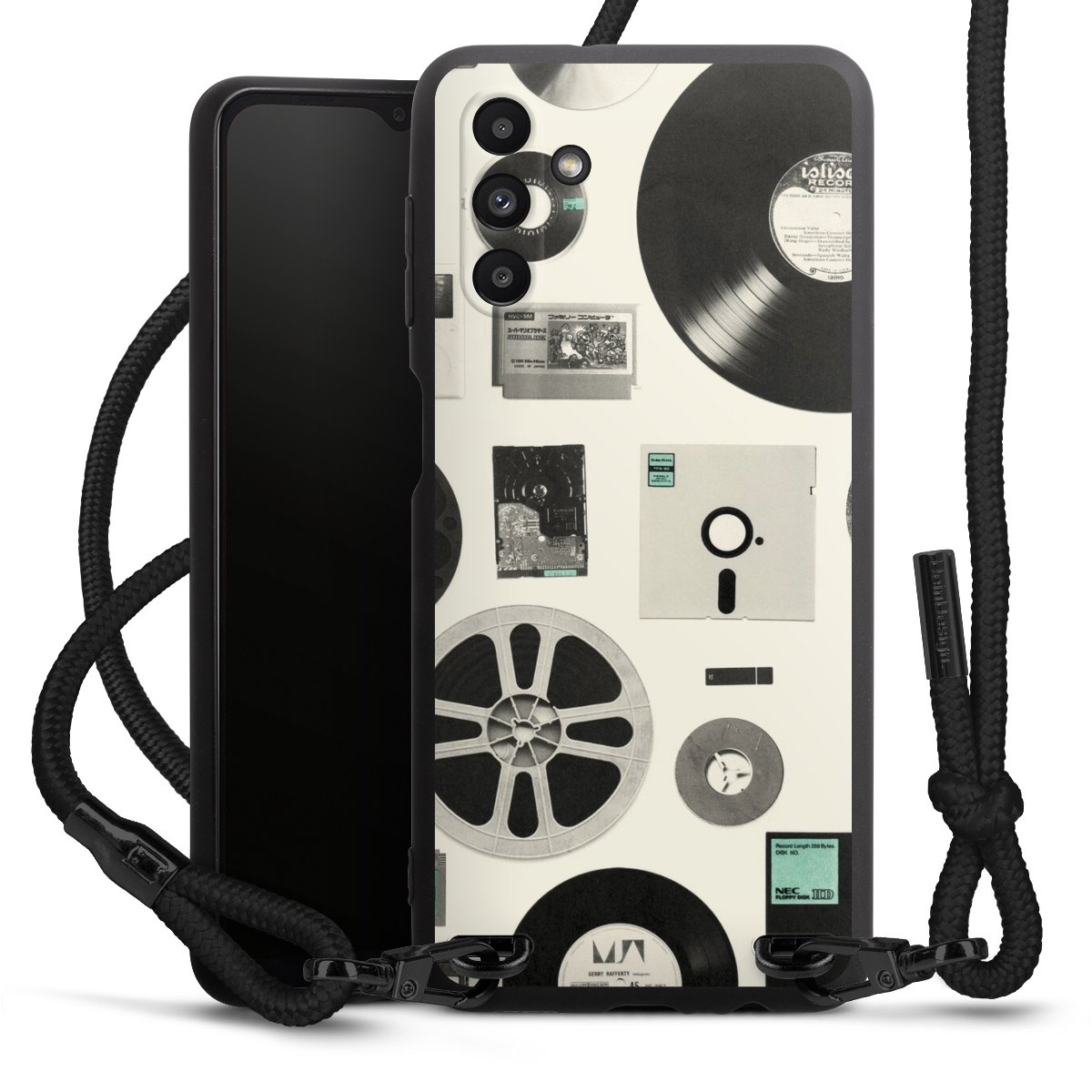 Pure Black: Handyhülle, Stoffband und Metalldetails in stylischem Mattschwarz.