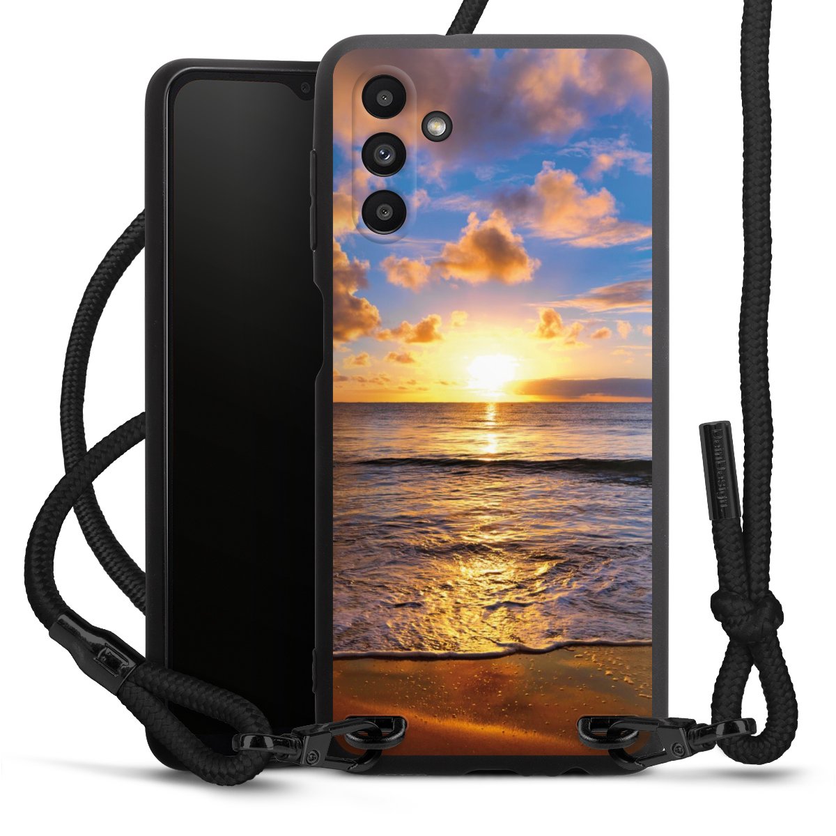 Bei dieser Handyhülle nutzen wir das solide Direktdruck-Verfahren, weshalb der Druckbereich ausschließlich die Rückseite umfasst und der Rand hingegen unbedruckt bleibt. Das Case zum Umhängen kann sowohl unbedruckt, als auch vollflächig oder partiell bedruckt bestellt werden. Wähle für Dein Design entweder eines unserer exklusiven Shop-Motive, oder werde kreativ und gestalte Dein Wunschdesign zum Beispiel mit Fotos und Overlays selbst. Designe Dir Dein persönliches Trend-Accessoire und setze ein individuelles Statement auf den Straßen.