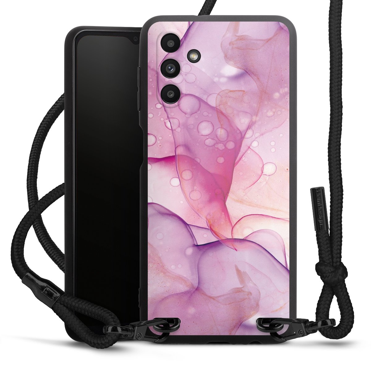 Pure Black: Handyhülle, Stoffband und Metalldetails in stylischem Mattschwarz.