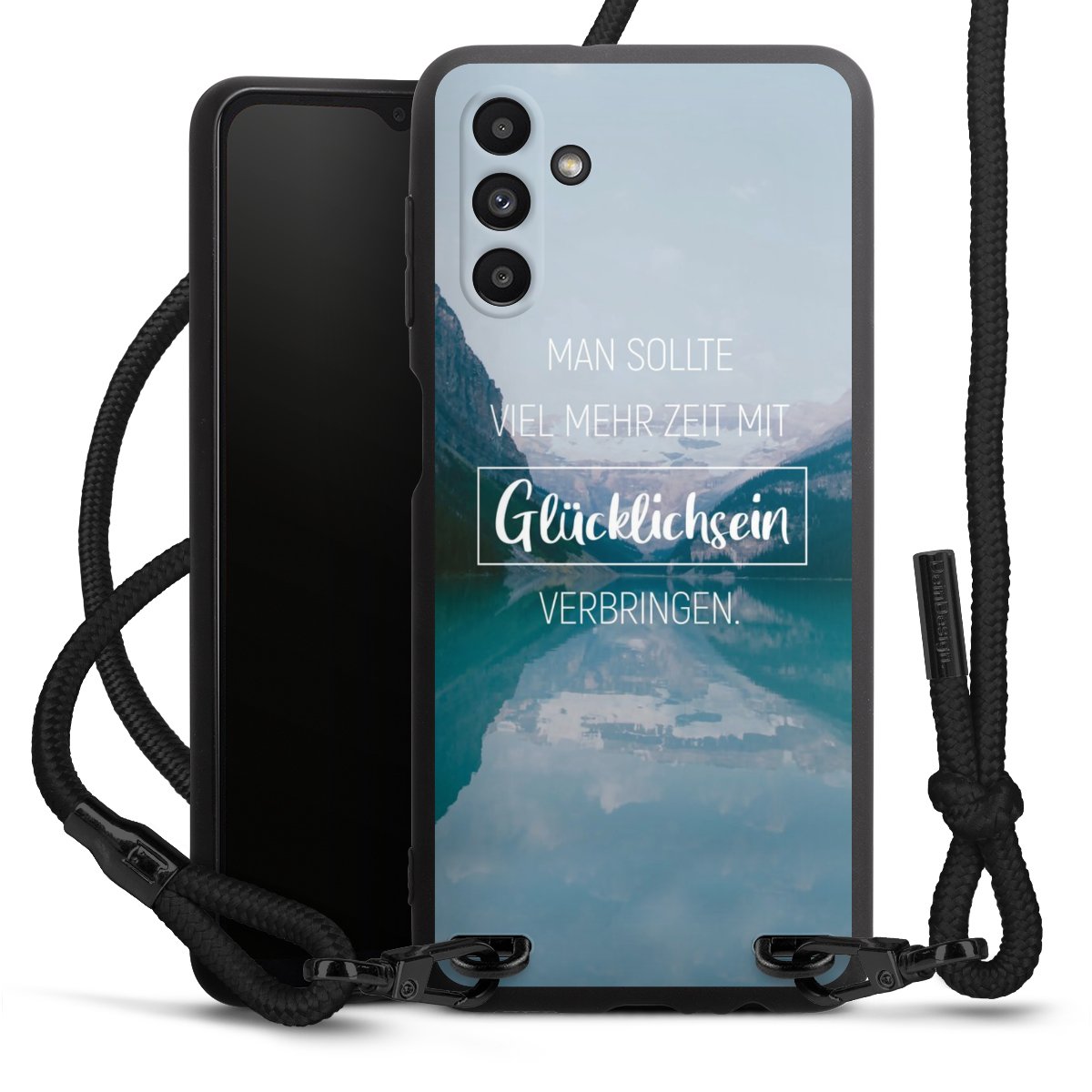 Pure Black: Handyhülle, Stoffband und Metalldetails in stylischem Mattschwarz.