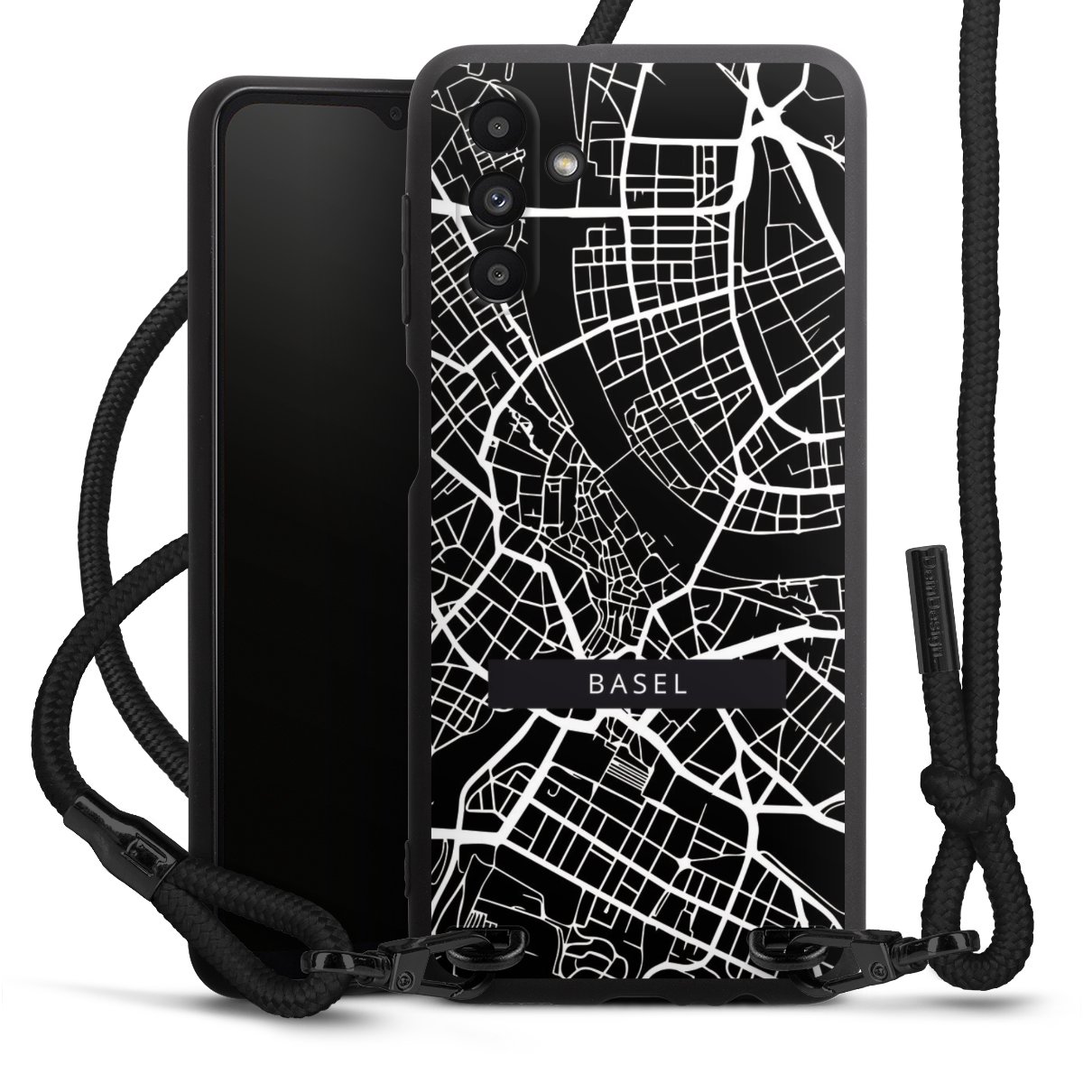 Pure Black: Handyhülle, Stoffband und Metalldetails in stylischem Mattschwarz.