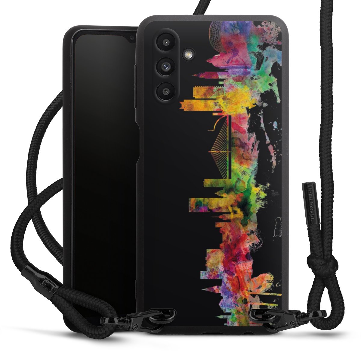 Bei dieser Handyhülle nutzen wir das solide Direktdruck-Verfahren, weshalb der Druckbereich ausschließlich die Rückseite umfasst und der Rand hingegen unbedruckt bleibt. Das Case zum Umhängen kann sowohl unbedruckt, als auch vollflächig oder partiell bedruckt bestellt werden. Wähle für Dein Design entweder eines unserer exklusiven Shop-Motive, oder werde kreativ und gestalte Dein Wunschdesign zum Beispiel mit Fotos und Overlays selbst. Designe Dir Dein persönliches Trend-Accessoire und setze ein individuelles Statement auf den Straßen.