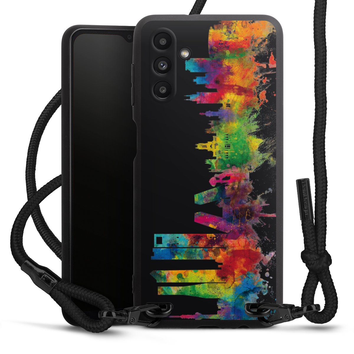 Bei dieser Handyhülle nutzen wir das solide Direktdruck-Verfahren, weshalb der Druckbereich ausschließlich die Rückseite umfasst und der Rand hingegen unbedruckt bleibt. Das Case zum Umhängen kann sowohl unbedruckt, als auch vollflächig oder partiell bedruckt bestellt werden. Wähle für Dein Design entweder eines unserer exklusiven Shop-Motive, oder werde kreativ und gestalte Dein Wunschdesign zum Beispiel mit Fotos und Overlays selbst. Designe Dir Dein persönliches Trend-Accessoire und setze ein individuelles Statement auf den Straßen.
