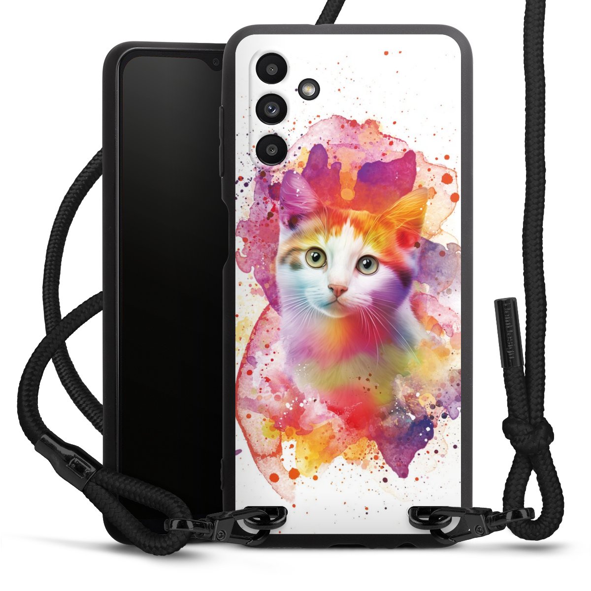 Die mattschwarze Silikonhülle besteht aus flexiblen TPU (thermoplastisches Polyurethan) und bietet robusten Schutz. Durch das langlebige, bruchsichere Material ist die Hülle biegsam und formbeständig zugleich. Die matte Oberfläche lässt Dein Design besser zur Geltung kommen und ist weniger anfällig für Fingerabdrücke und Schmutz. Das stylische Trend-Accessoire liegt griffig in der Hand und wird optimal von der Handykette aus Stoff (Polyester) ergänzt. Das geflochtene Stoffband ist ca. 1,70 Meter lang mit einem Durchmesser von ca. 0,5cm. Aufgrund der besonderen Knotentechnik ist das Band durch einfaches Ziehen in der Länge verstellbar. Als kleines i-Tüpfelchen haben wir das Band mit schicken Metall-Verschlüssen in Mattschwarz versehen.