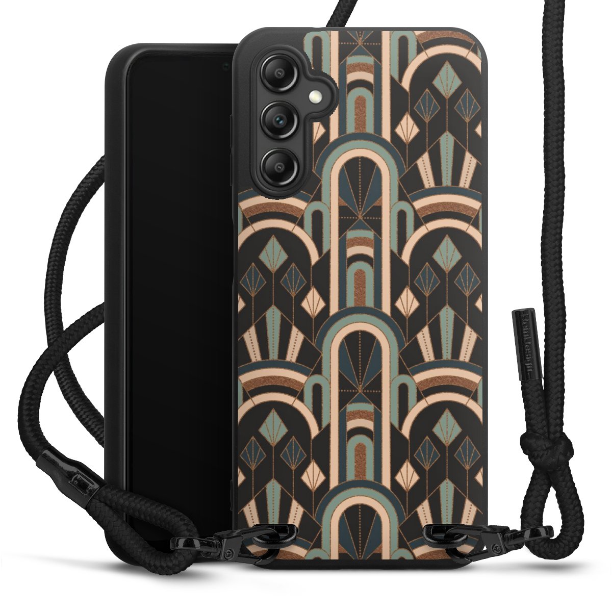 Pure Black: Handyhülle, Stoffband und Metalldetails in stylischem Mattschwarz.