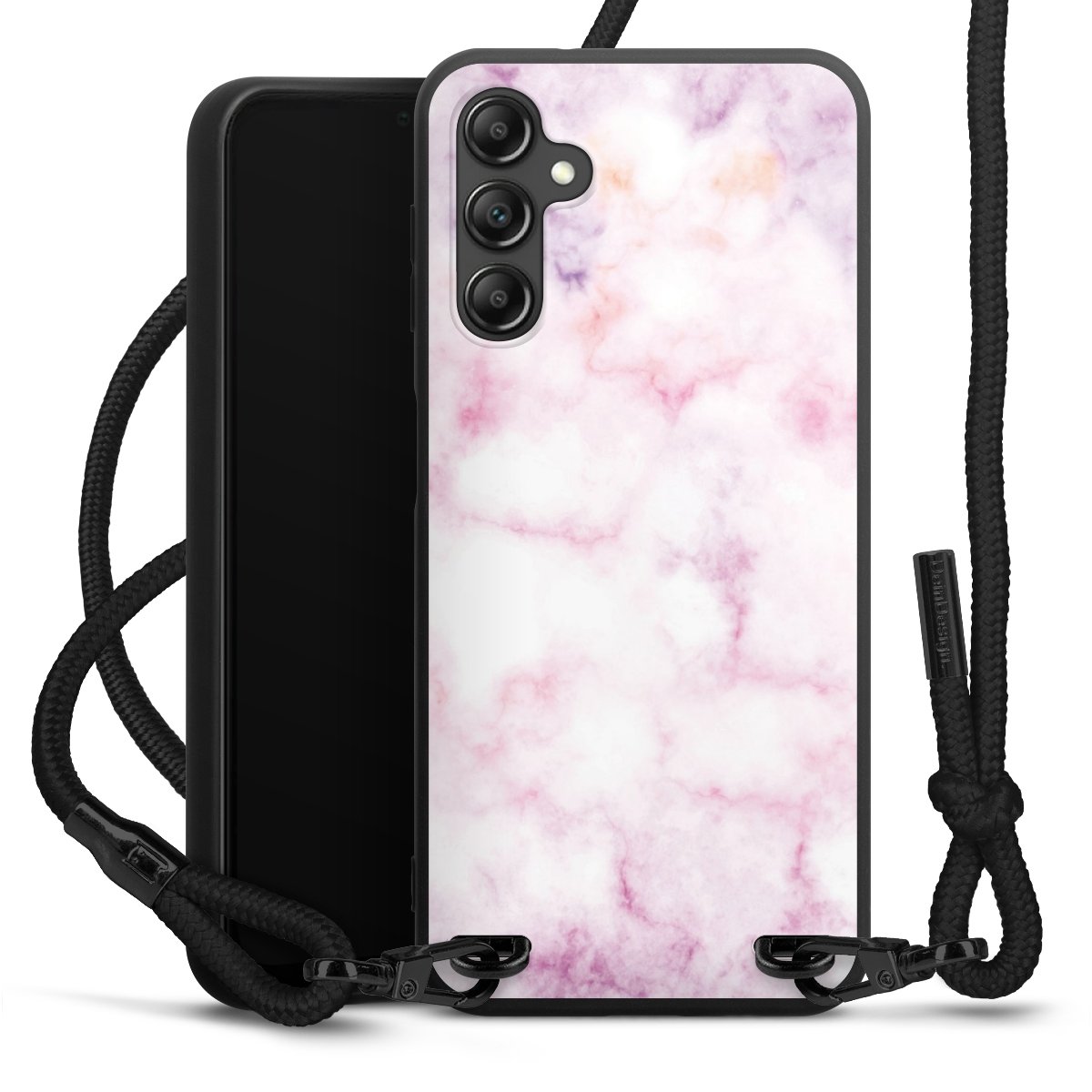 Pure Black: Handyhülle, Stoffband und Metalldetails in stylischem Mattschwarz.