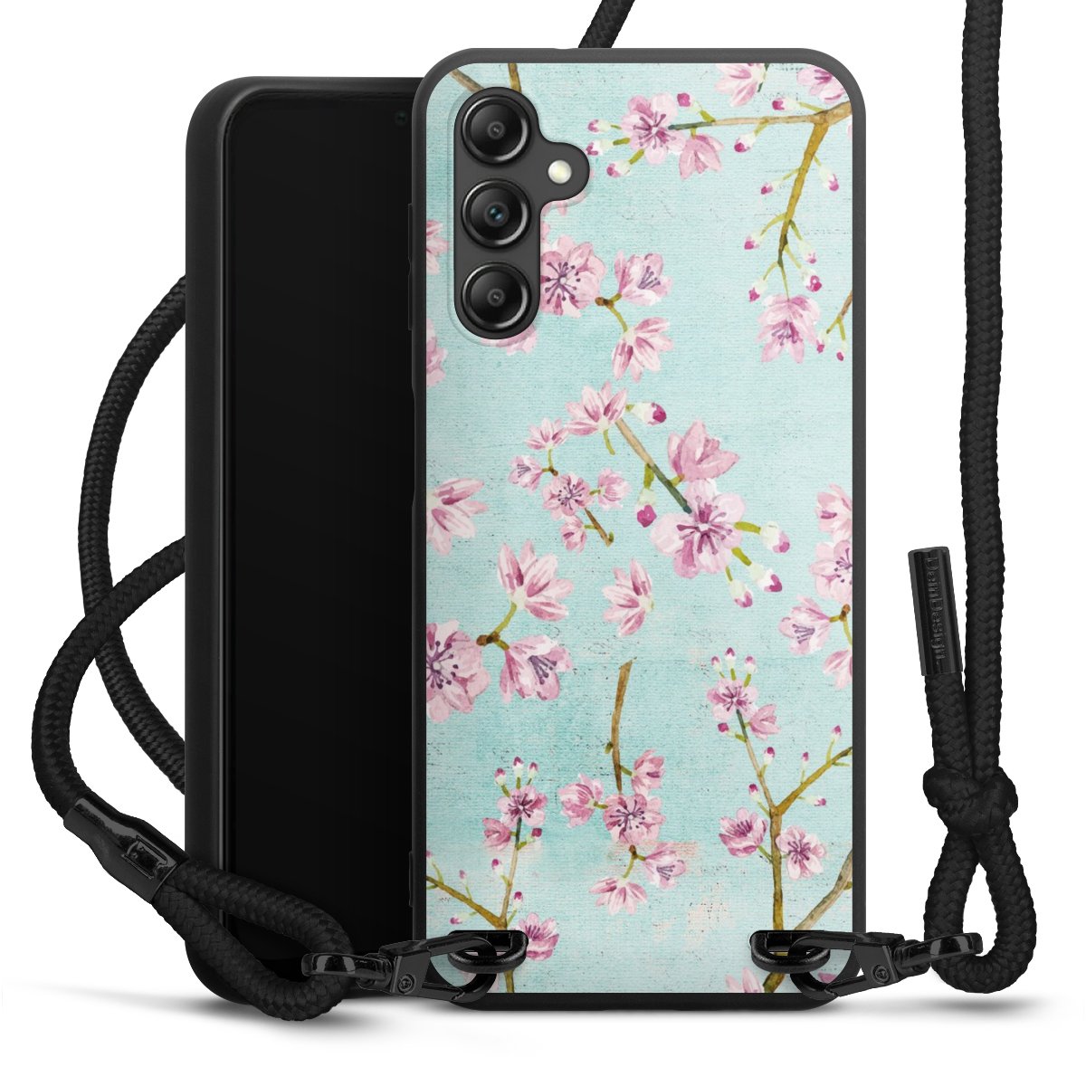Pure Black: Handyhülle, Stoffband und Metalldetails in stylischem Mattschwarz.