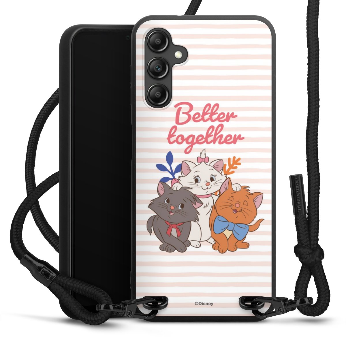 Pure Black: Handyhülle, Stoffband und Metalldetails in stylischem Mattschwarz.